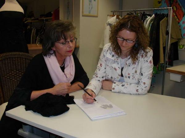 1. Ich bespreche mit der Kundin wie die Kleidung aussehen soll, welchen Stoff Sie verwenden möchte und mache eine Skizze.